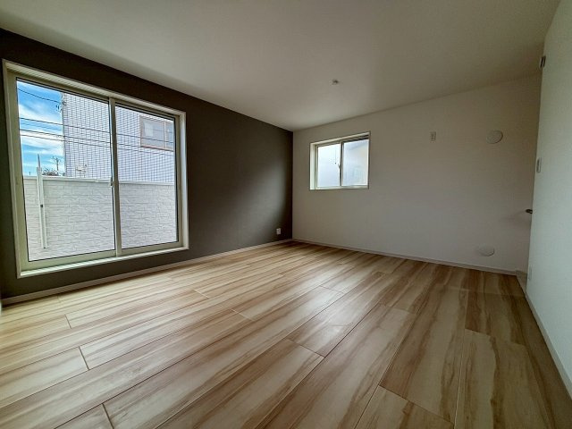 アクセントを意識した壁紙と床色のバランスがとても落ち着く空間を演出致します。2階リビングは、13.6畳でキッチンは対面式搭載です!