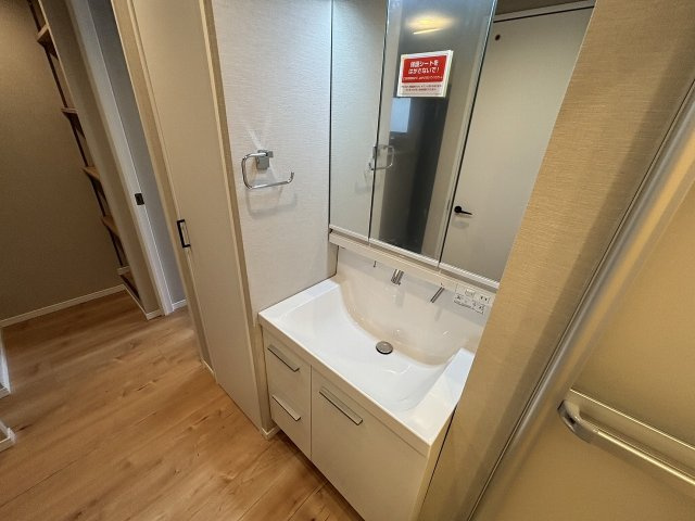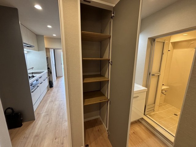 洗面横にもしっかり収納設備を配置、あって困らないアイテムの一つ♪使用用途は様々可能です!